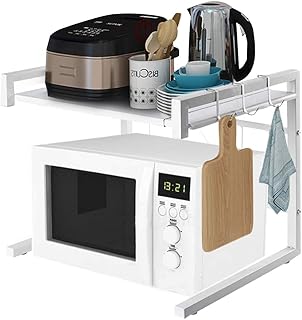 Meckily 電子レンジ 棚 ラック、レンジ台、伸縮設計で、サイズは自由に調整できます。 幅伸縮式(幅43-65cm) 電子レンジ上ラック 2段式 キッチン 支える力が強 収納 棚 トースター ラック ステンレス製 (ホワイト)