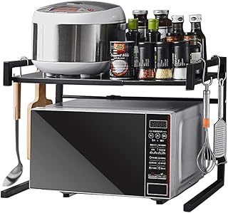 Meckily レンジ台 、電子レンジ 棚 ラック、伸縮設計で、サイズは自由に調整できます。 幅伸縮式(幅43-65cm) 電子レンジ上ラック 2段式 キッチン 支える力が強 収納棚 トースター ラック ステンレス製 (ブラック)