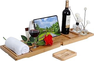 YULONG Lab 折りたたみ ハンドメイド 木製 竹 浴槽 キャディトレイ 高級バスタブ用 防水 伸縮 バスルームトレイ バスタブトレイ ソープホルダー付き