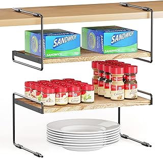 SpaceAid キャビネットシェルフオーガナイザー 2個パック キッチンカウンターオーガナイザーラック 棚下ライザー パントリー食器棚ストレージオーガナイザー 金属と木 ブラック&ナチュラル 幅16インチ